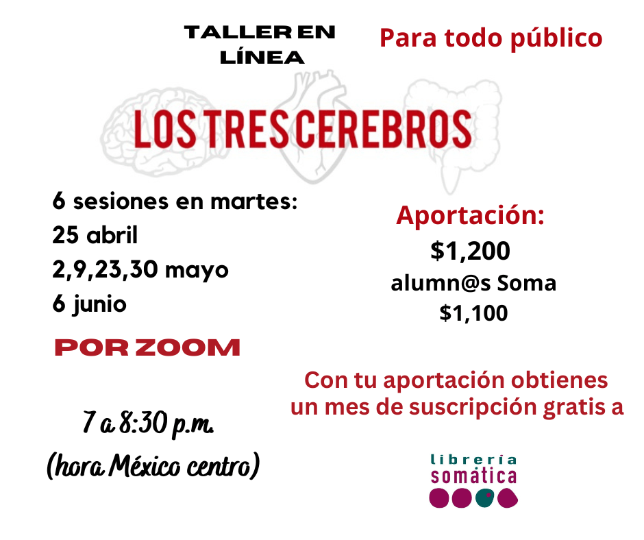 Fechas: el taller dura 6 sesiones: 25 de abril, 2,9,23,30 de mayo y 6 de junio Horario: de 7 a 8:30 p.m. (México centro) por la plataforma zoom Aportación: $1,200 pesos en un solo pago/ $1,100 para alumn@s que hayan tomado talleres previamente con Soma.