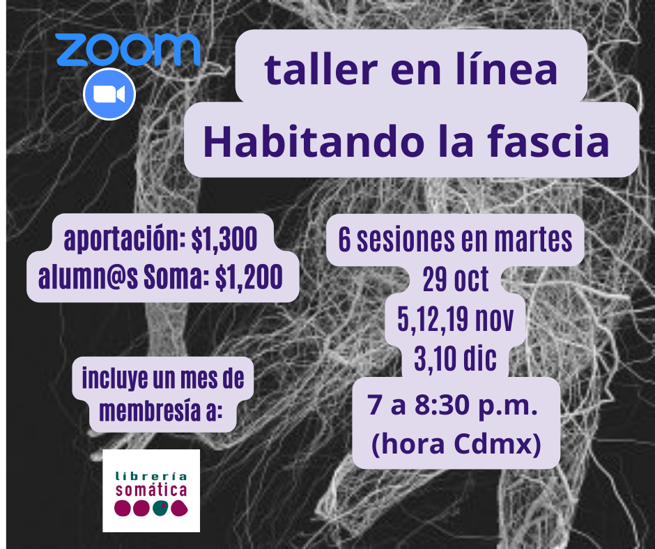 Aportación: $1,300 (en una sola exhibición) $1,200 alumn@s que ha tomado previamente talleres con Soma. Incluye el acceso a las sesiones en directo y a las grabaciones (disponibles hasta el 10 de enero)
